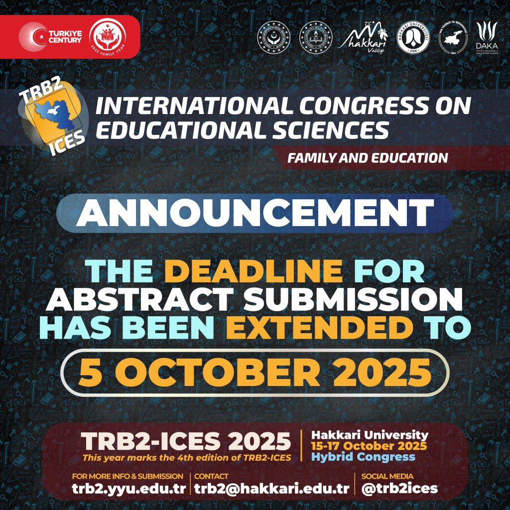 We are excited to announce that the third edition of the TRB2 International Education Sciences Congress III (TRB2-ICES 2024) will be held on 18-20 October 2024, at Van Yüzüncü Yıl University. We encourage researchers, academics, and practitioners from around the world to participate and contribute to the success of the congress.